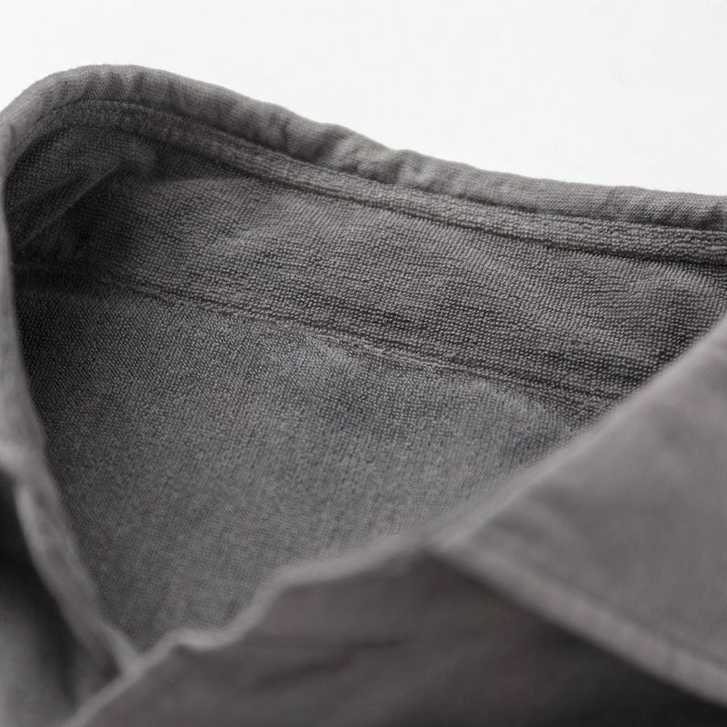 表面は平織生地のようにニュアンスのあるフラットな表情ですが、肌に触れる内面は高さ1mm以下という繊細なパイルを持つ特別な生地。 “ふわっサラッ”とした独特な肌触りと、ふわりと身体を包み込む至極のフィット感を実現しています。