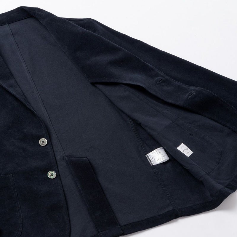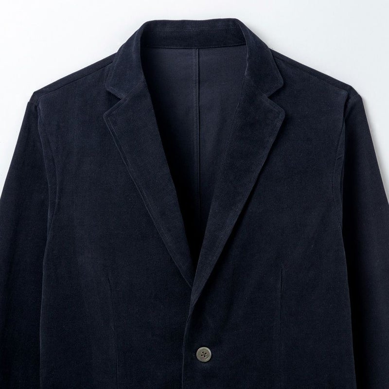 スタンダードなシングルの2つボタンで、裏地や肩パッドのないライトジャケットです。