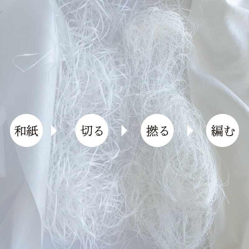 和紙布は、和紙自体を服に仕立てたものではなく、和紙を細い帯に切り、撚りをかけて糸に加工したもの。その糸を一般的なカットソーと同様に編み、生地に仕立てています。綿やリネンと同等の耐久性もあり、洗濯を重ねても毛羽立ちが少なく、風合いが損なわれにくい生地です。