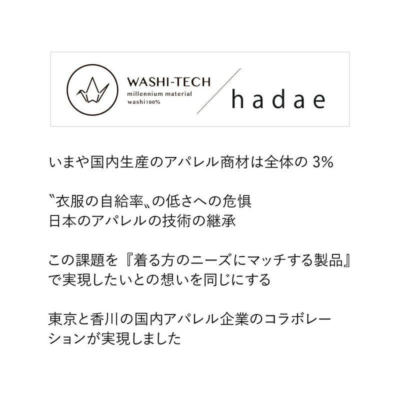 日本のアパレルの「素材」「加工」「縫製」技術の継承を、着る人のニーズにマッチさせた製品で実現したいとの想いを共有する『株式会社 和興』とhadaeのコラボレーション。染色加工も東京・向島の『株式会社 川合染工場』が手がけるなど、素材から加工、縫製に至るまで国産にこだわっています。