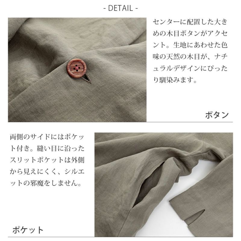 天然にこだわった貝ボタンを使用しており、上品で美しい光沢感と色味がナチュラルな生地の風合いを引き立てます。