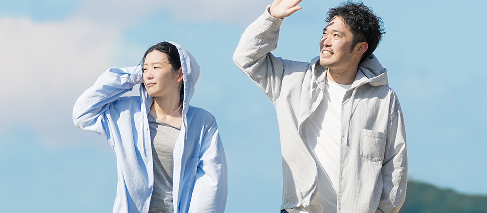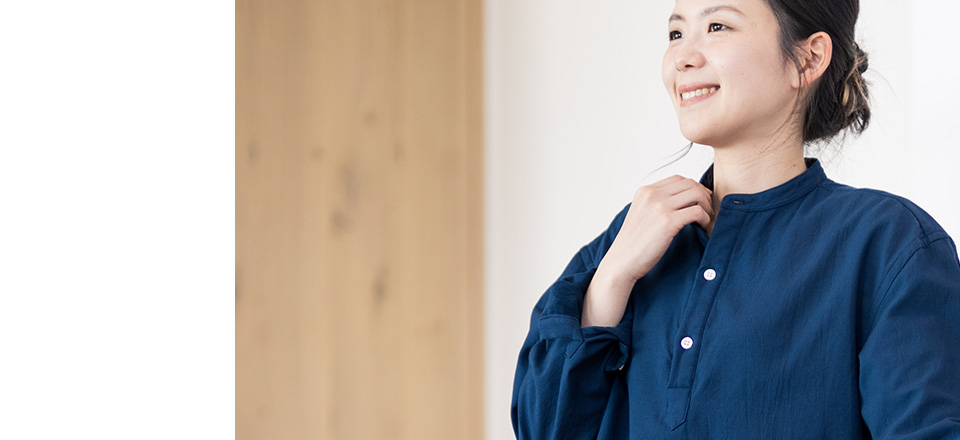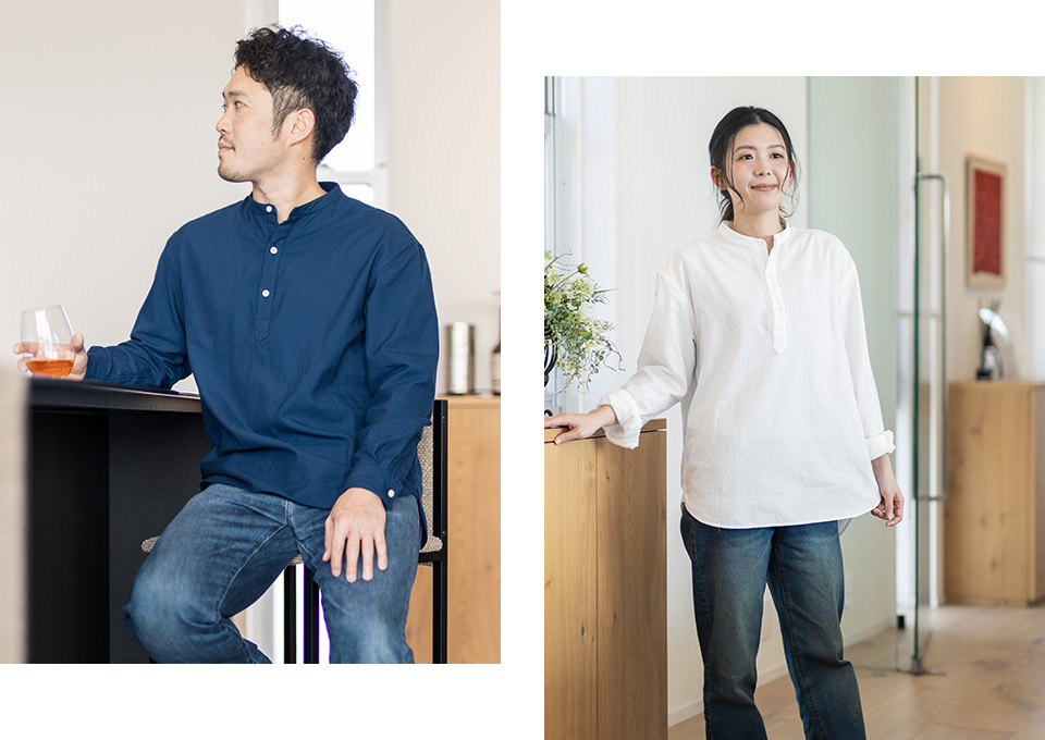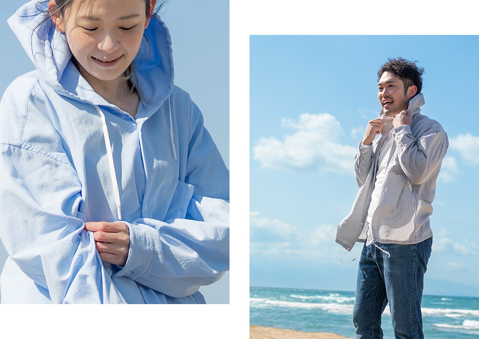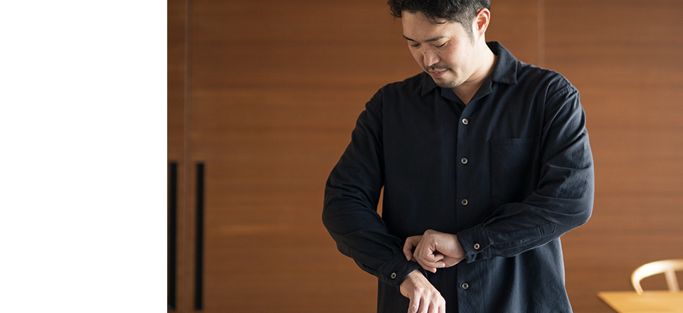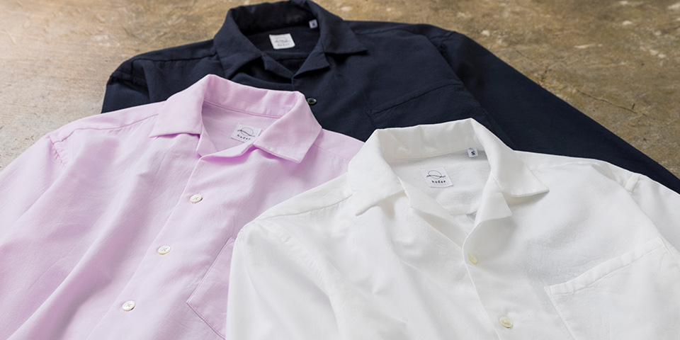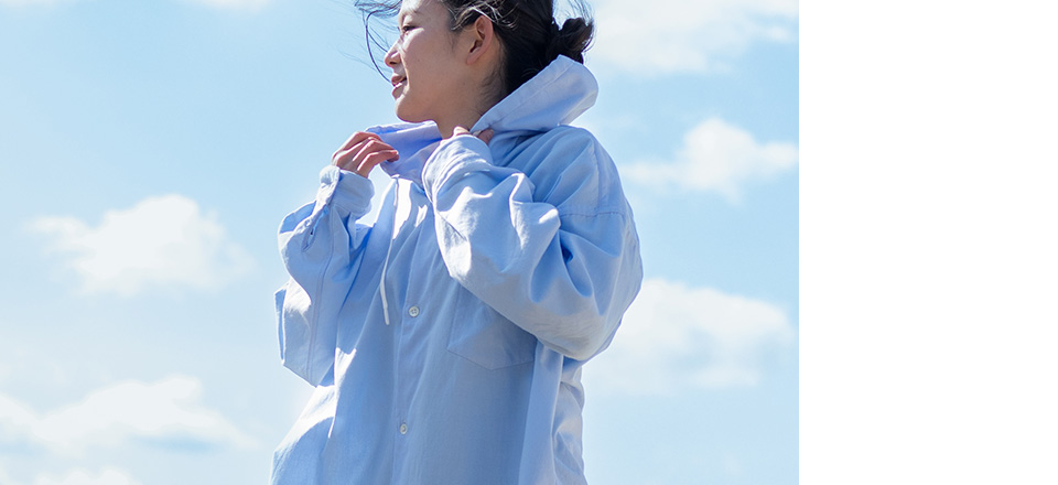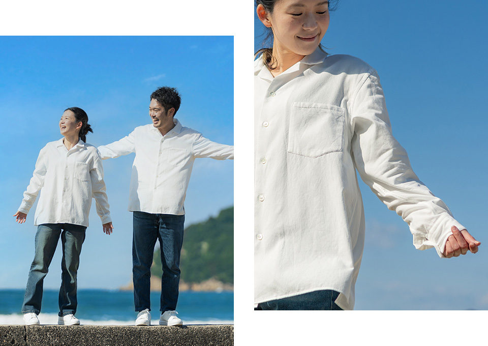 衣類用のタオルとして3年ものあいだ試行錯誤を重ねて開発。表側はよく目にする平織生地に見えますが、内側の高さ1mm以下という繊細なパイルの“ふわっサラっ”とした独特な肌触りは、他には無い心地よさ。シャツと肌との間に空気の層が作られるため『夏は汗を吸収してベタつきにくく』『冬は体の熱を保って暖かく』オールシーズン快適な着ごこちを楽しめます。