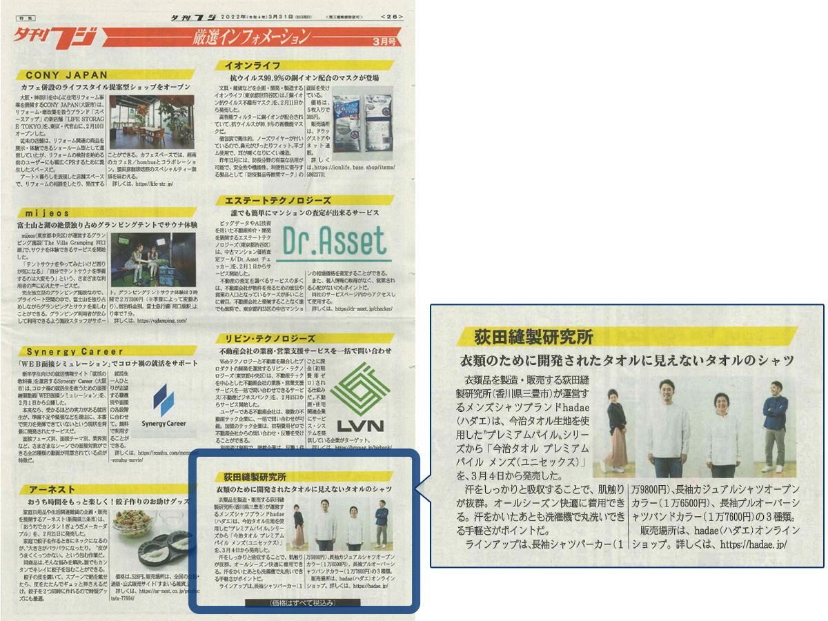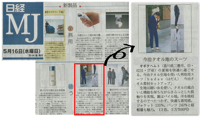 - 日経MJ 「新製品」コーナーにて「【hadae】今治タオル素材 セットアップ 」が紹介されました。