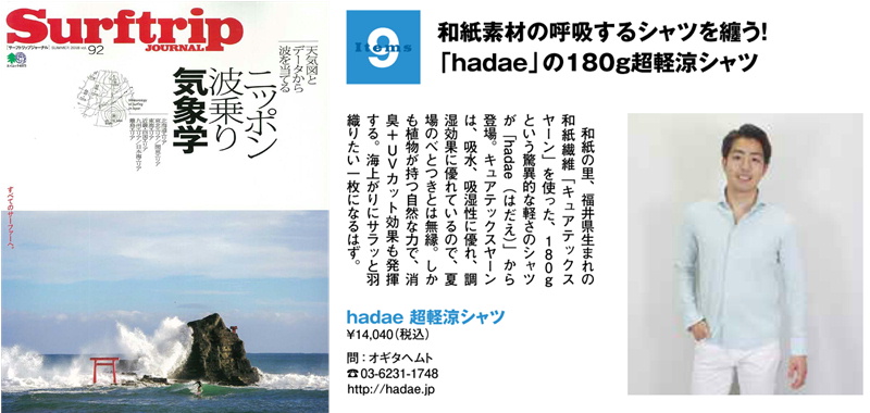 - サーフトリップジャーナル Vol.92に【hadae】和紙素材 超軽涼シャツが掲載されました。