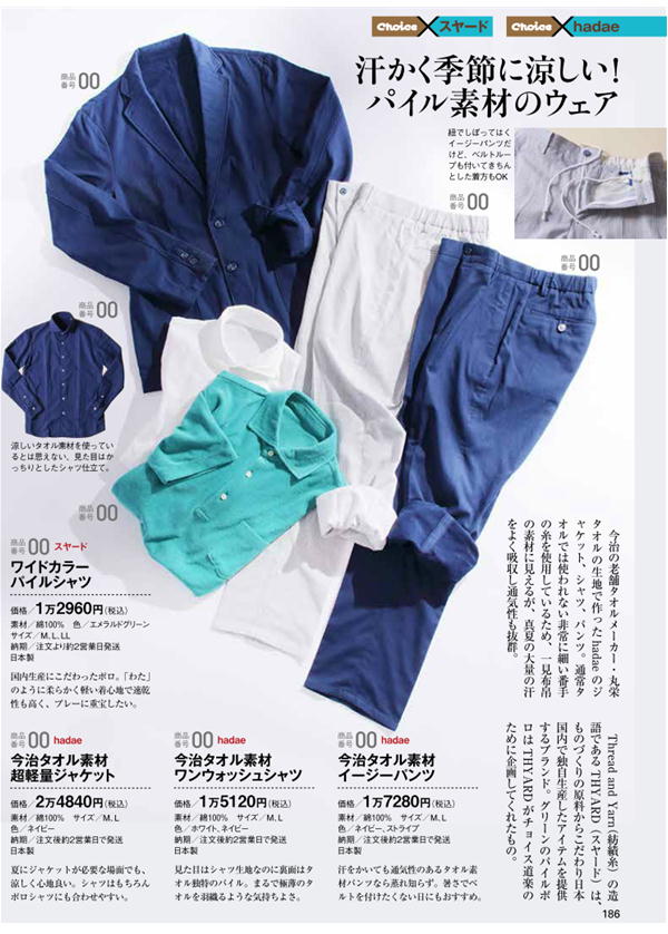 - チョイス7月号(2018年夏号)にhadaeのジャケット、パンツ、シャツが掲載されております。