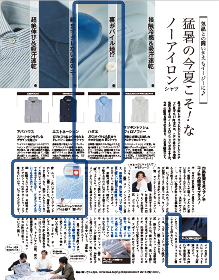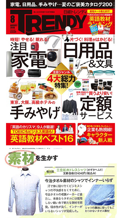 - 日経トレンディ2018年8月号に「三豊肌衣ドレスシャツ」が掲載されました。