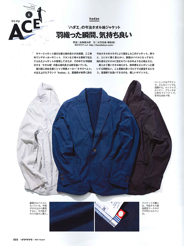 - <hadae 今治タオル地ジャケット>が【EVEN 2020年8月号】に掲載されました。