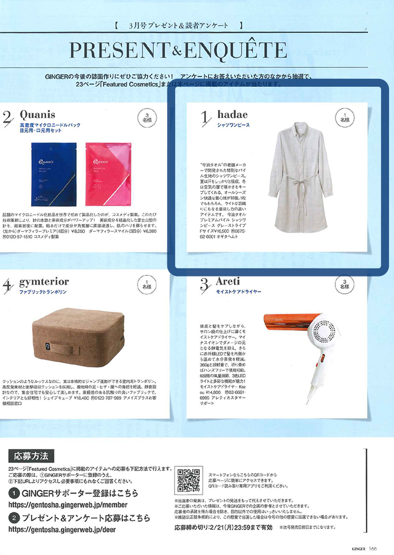 - <今治タオル レディース シャツワンピース>が【GINGER 2022年3月号】のプレゼントページに掲載されました。
