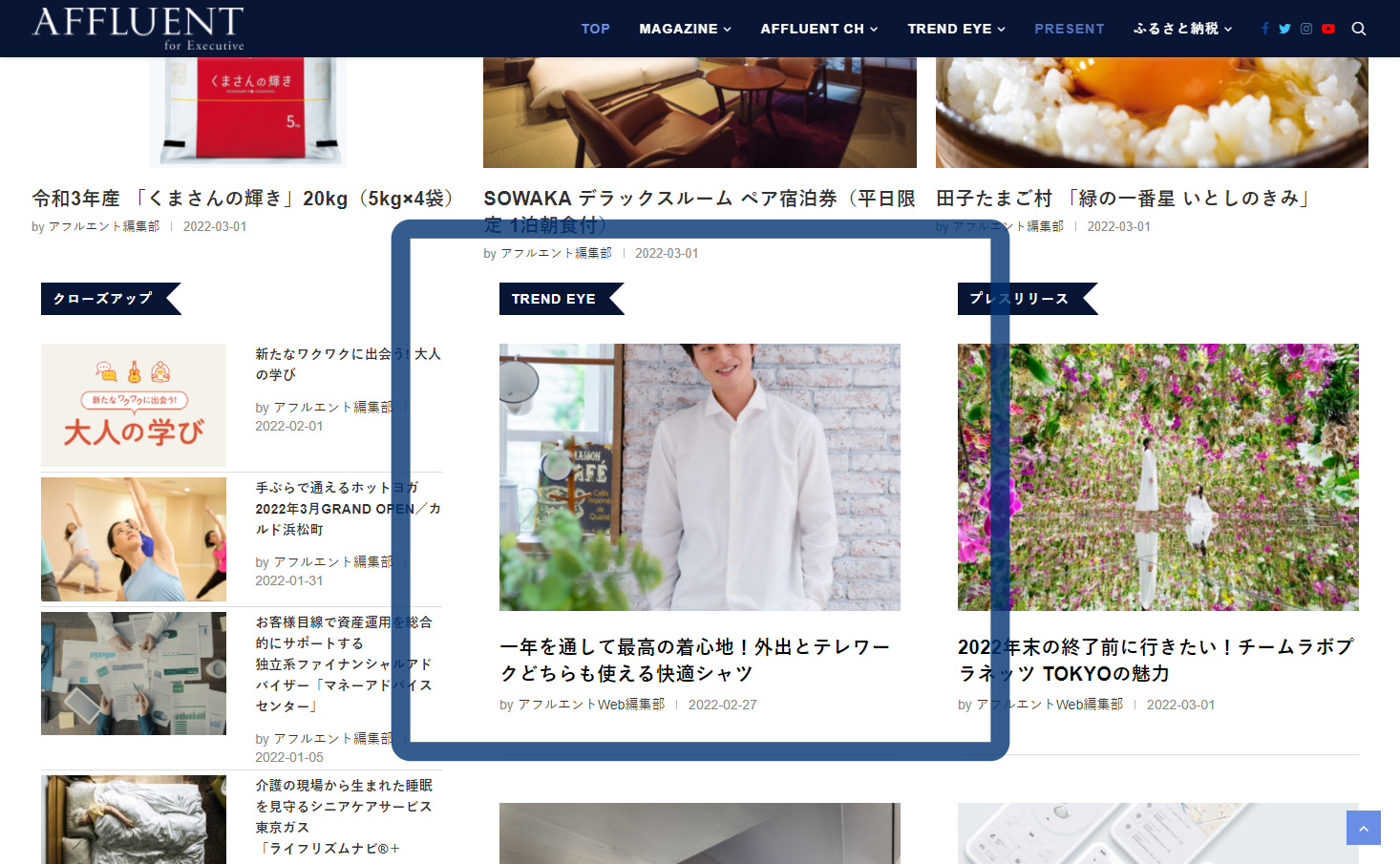 - <今治タオル プレミアムパイル 4商品>が【AFFLUENT for Executive】のTREND EYEページに掲載されました。