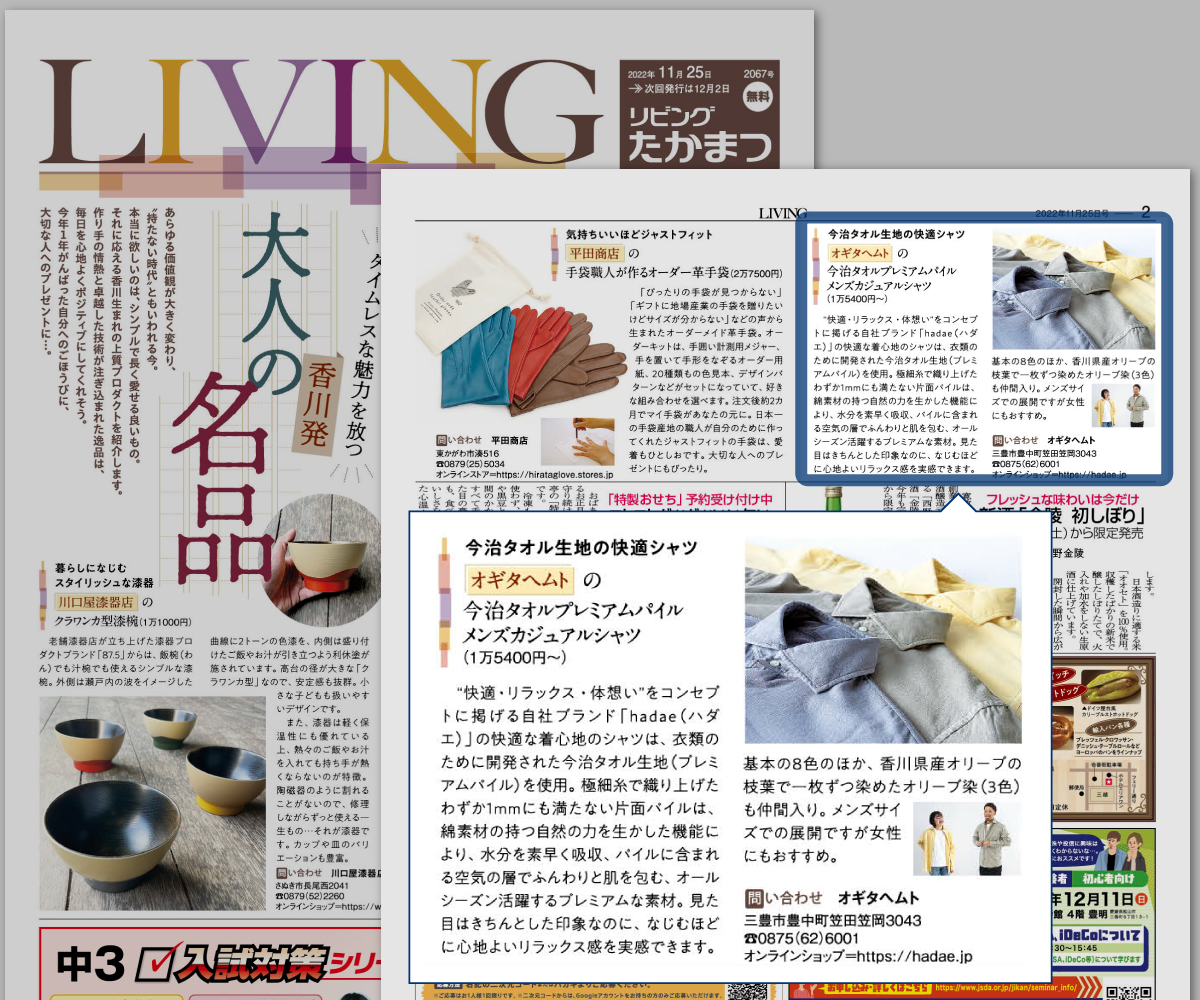- <今治タオル メンズ カジュアルシャツ>が【リビングたかまつ 2022年11月25日号】に掲載されました。